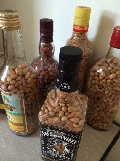 說到當(dāng)?shù)氐牧闶?,首先就是這種用玻璃瓶裝的花生米啦烤椰絲啦之類的,在科特迪瓦的任何一個海灘邊都會有很多當(dāng)?shù)厝嗽诙凳?,甚至大超市里也找得到。像下圖這樣容量的玻璃瓶一瓶賣1000西法,折合成人民幣12塊錢左右。