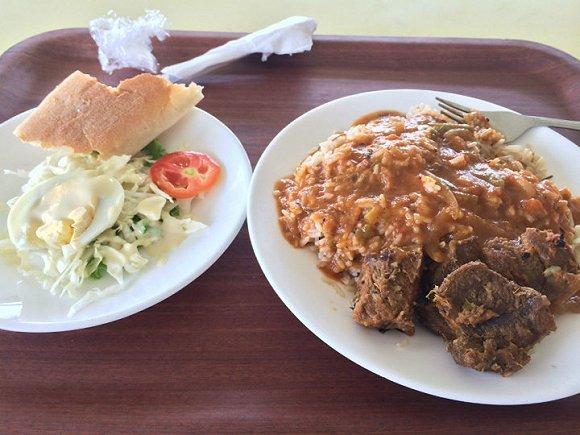 下面兩張是我中午在公司食堂吃的工作餐,算是典型的當(dāng)?shù)夭耍罢呤俏业牧?xí)慣,后者澆上醬汁是當(dāng)?shù)厝说牧?xí)慣。