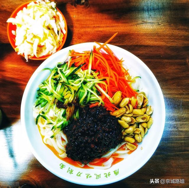 老北京炸醬面,要五花肉慢火炸醬,配上黃瓜絲。豆芽、芹菜等各種菜碼,再來(lái)幾瓣臘八蒜,一大碗管飽。專(zhuān)營(yíng)店能吃到,家家戶(hù)戶(hù)也都會(huì)做。(說(shuō)到這里,想起去韓國(guó)時(shí),導(dǎo)游說(shuō)他們統(tǒng)稱(chēng)中國(guó)人叫“炸醬面”,雖然體現(xiàn)了我們的面食文化,但當(dāng)時(shí)也很不愛(ài)聽(tīng),給韓國(guó)導(dǎo)游一個(gè)差評(píng))。
