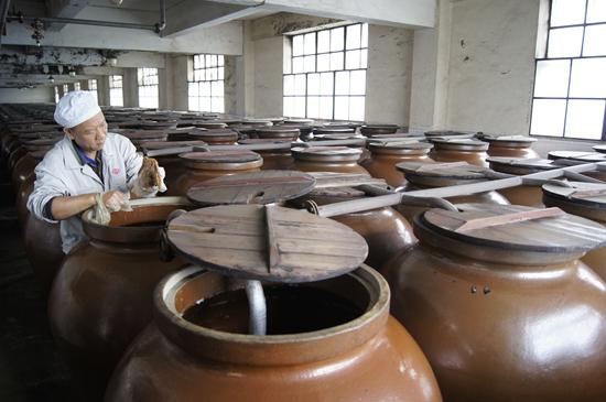 九江雙蒸酒傳統(tǒng)釀造技藝主要以大米為原料,用大米、黃豆制成酒曲,采用續(xù)添蒸飯、再度發(fā)酵、冷卻餾酒、齋酒貯存、陳肉醞浸、精心勾兌、過濾包裝的方法釀造白酒。