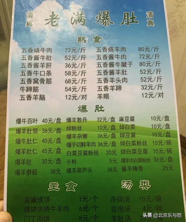 雖然叫老滿爆肚啊,但他們家爆肚我很少吃,一個是貴,一個是我不怎么愛喝白的,不對路,每次來這就是燒餅夾肉配羊雜湯或者豆泡湯,廢話少說,您先看菜單!