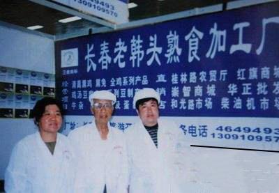 東北人吃干豆腐最常見的方法就是卷大蔥、黃瓜沾大醬,但老韓頭豆腐串的做法與眾不同,是將干豆腐用小竹簽或者牙簽串好放入燉好的雞湯中再煮一遍。他每天總要早早地推著小車上街賣豆腐串,整天戴著一頂白帽子,在同志街和紅旗街走來走去。人們親切地把他叫做“老韓頭”。老韓頭原名韓再發(fā),回族人,祖籍山東韓家寨。從小和父親闖關(guān)東來到吉林農(nóng)安小合隆落了腳,開了一家牛肉鋪維持生活。長春解放后,韓在發(fā)煥發(fā)了新生活的熱情與勇氣,憑著一身好手藝從事個(gè)體經(jīng)營韓再發(fā)別出心裁地把干豆腐里夾上蔥花、辣椒沫、芝麻、香菜,包成小卷,再用小棍兒串起來賣。頭一天,街上的老百姓不明白這是什么,一串串金黃又柔軟的豆腐串香味四溢,還沒吃上就流口水了。男男女女老老少少這么一吃,從此就放不下了。大約過了半年,老韓頭豆腐串就在長春人心里扎下了根,并一直延續(xù)到今天。
