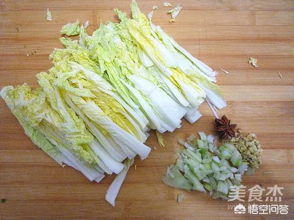 2.娃娃菜順著切成粗絲蔥姜切末、八角1粒備用