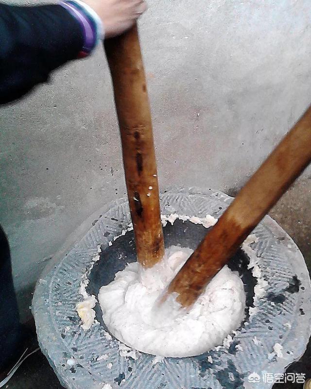 說起家鄉(xiāng)過年的美食,我腦海中浮現(xiàn)的第一個畫面就是幾個大漢拿著木錘在“打粑粑”的場景,“一二,嘿喲,一二,嘿喲”,喊起口號,有節(jié)奏的錘打著蒸熟的糯米飯。這個美食就是過年粑,其他地方也叫做“年糕”。年糕,顧名思義就是過年的時候才做的,而實際上也是如此。我們這里的年糕是用自家的糯米來泡之后進行蒸,蒸熟就放到一個特定的石頭容器里面,用人力進行捶打,打成糕狀,用手抓取乒乓球大小的團子,捏成餅狀,涂上一些黃油,就算完成了。