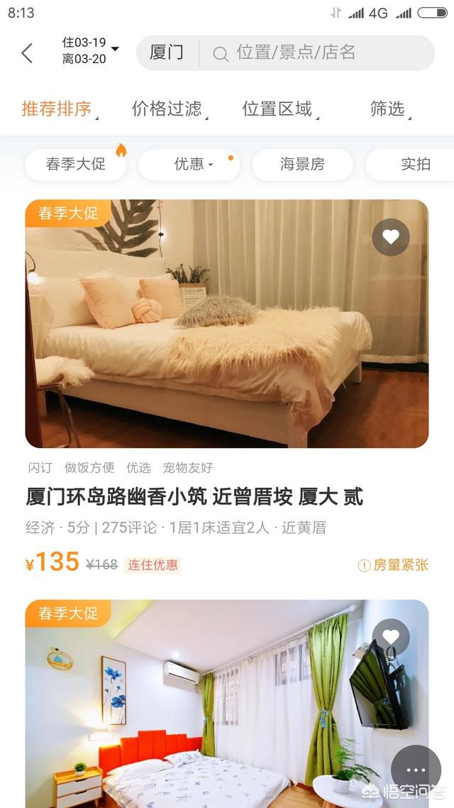 話歸主題:如何找到性價(jià)比高的民宿,手機(jī)應(yīng)用千萬個,用好一個就行了。在此推薦我常用的“去哪兒旅行”。打開應(yīng)用的界面如圖一,點(diǎn)開客棧民宿進(jìn)入圖二。點(diǎn)開“推薦排序”,可以選擇價(jià)格由高到低還是由低到高,點(diǎn)開“價(jià)格過濾”可以選擇價(jià)格區(qū)間,比如選擇100-120的。點(diǎn)開“位置區(qū)域”可以選擇當(dāng)?shù)氐母鞣N圈,比如火車站地鐵站醫(yī)院學(xué)?;蛏虡I(yè)街景點(diǎn)等等。點(diǎn)開“篩選”選擇的內(nèi)容就更多了,如網(wǎng)絡(luò)空調(diào)洗澡用品電吹風(fēng)拖鞋等等等等。然后就能看到一大排你篩選過的民宿了。