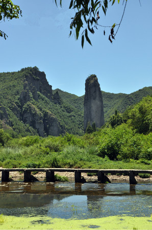 鼎湖峰溯溪而上數(shù)百米有巖山,高臨溪上,下有深潭。宋代理學(xué)家朱熹常憩于此,故巖名晦翁巖,潭名朱潭。站在仙堤上,遙望鼎湖峰,您可以欣賞到奇峰、秀山、松濤、柳園、小橋、流水。