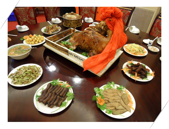 蒙古族人民世居草原,以畜牧為主要生產(chǎn)方式。以奶和肉類食品為主,馬奶酒、手扒肉、烤羊肉和茶是他們?nèi)粘I钭钕矚g的飲料食品和待客佳肴。遼寧遼西的蒙古族比較早地從事農(nóng)耕生產(chǎn),所以在飲食上既保留了蒙古族的傳統(tǒng)食俗,還有一些東蒙地區(qū)獨特的美食。如全羊湯、“手把羊肉”、蒙族餡餅、喇嘛糕等。